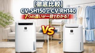 シャープの衣類乾燥除湿機「CV-SH150」と「CV-RH140」。どちらもハイブリッド方式でプラズマクラスター25000を搭載した人気モデルですが、「正直どっちを選べばいいの?」と迷っている方も多いのではないでしょうか。見た目はそっくりで...