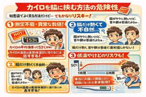 それに、カイロを長時間脇に挟んでいると、低温やけどのリスクもあります。本当に火傷して病院に行く羽目になったら、本末転倒ですよね。