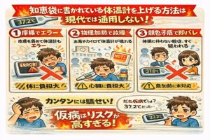 知恵袋には「お湯につける」「摩擦で温める」「カイロを使う」など、様々な方法が書かれていますが、その多くは現代の体温計には通用せず、むしろバレるリスクが高い方法です。