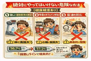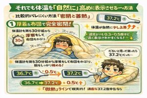 どうしても高めにしたいなら、30分間の「布団内密閉」による蓄熱が最も自然です。ただし、上がるのはせいぜい0.5度程度。高熱を捏造するのは不可能です。