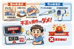 体温計はこの異常なカーブを検知すると、エラーを出すか、あるいは「42.0度」みたいな人間離れした数値を表示します。どちらにしても、一瞬で「あ、これ操作したな」とバレてしまうわけです。