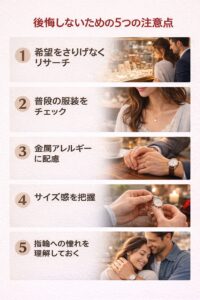 これが一番のリスク。実は「婚約指輪への憧れ」を持っている女性も多いんです。サプライズも素敵ですが、事前に本音を探っておくことも大切ですね。