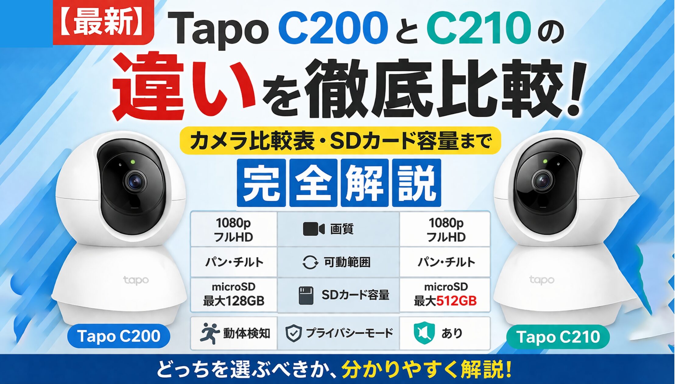 この記事では、TP-LinkのTapoシリーズで人気のC200とC210の違いをカメラ比較表つきで徹底解説します。SDカードの対応容量や実際の画質の差、用途別のおすすめまでまるごとまとめました。