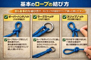 トポロジーのロープストラップには、カラビナやリングと組み合わせる方式が採用されています。ロープの結び方を知っておくとより活用の幅が広がります。