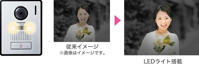 玄関子機にLEDライトが付いているので、夜間でも来訪者の顔をしっかり確認できます。防犯面でも安心ですね。